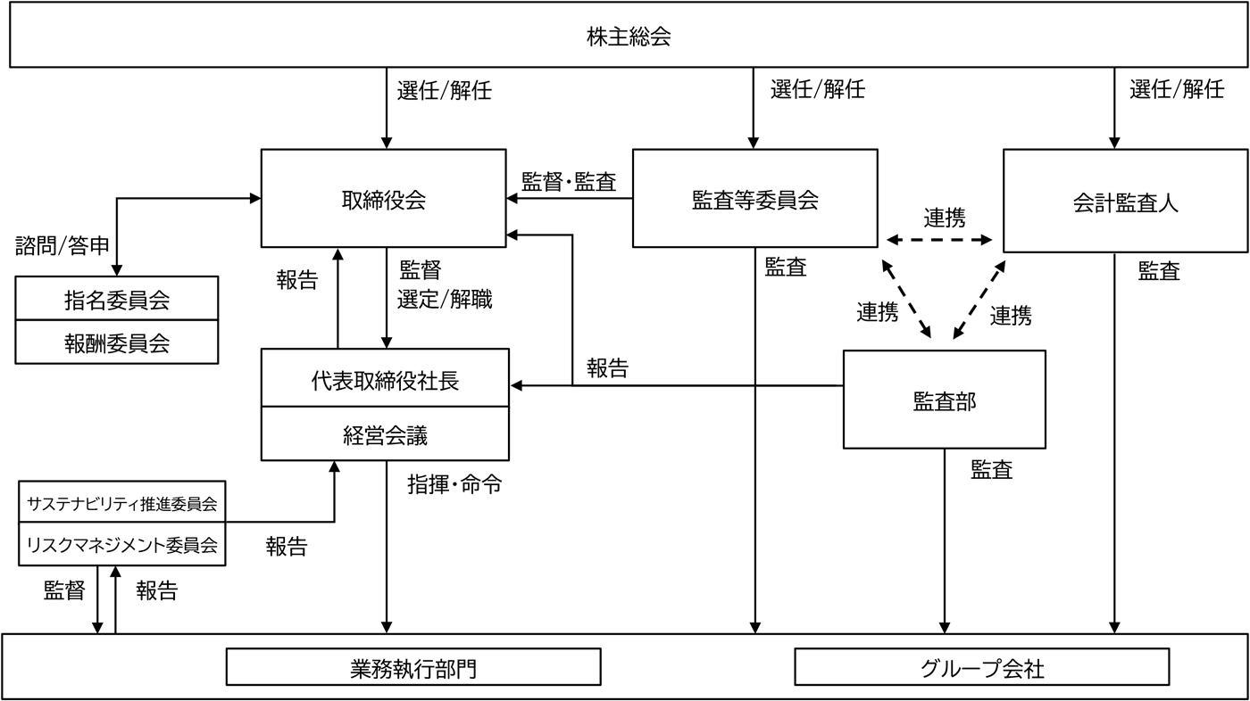 当社のコーポレートガバナンス体制は、監査等委員会設置会社として取締役会と監査等委員会によって、取締役の業務執行の監督および監査を行っております。業務執行については、取締役会の意思決定を迅速かつ的確に実行するため、執行役員制度を導入し、業務執行権限を執行役員に委譲して執行責任を明確にすることで経営の効率化を図っております。また、役員の指名・報酬については、取締役会の諮問機関として過半数の独立社外取締役で構成する指名委員会および報酬委員会を設置し、各委員会の答申を尊重して決定しており、決定過程の透明性・公正性を確保しております。
