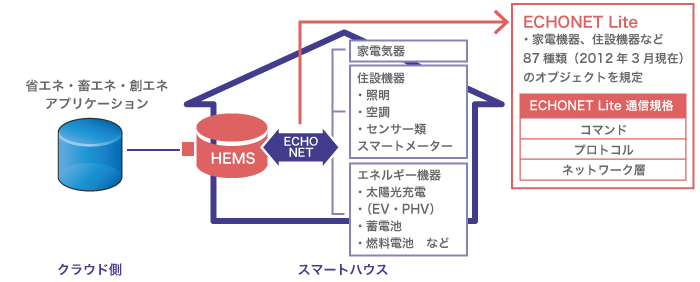 スマートハウスとは、ITを駆使して家庭内のエネルギー消費を最適に制御された住宅のことで、ECHONET Liteは、スマートハウスを構築するために、HEMSと家電機器、スマートメーターや太陽光発電システムなどの機器間の情報のやりとりを規定した通信規格です。2011年12月に、次世代のホームネットワーク用通信規格を検討する、エコーネットコンソーシアムが一般に公開しました。2012年2月には経済産業省がHEMSと家庭内機器をつなぐ標準インターフェースとして、「ECHONET Lite」を推奨するなどの決定事項が公表されました。