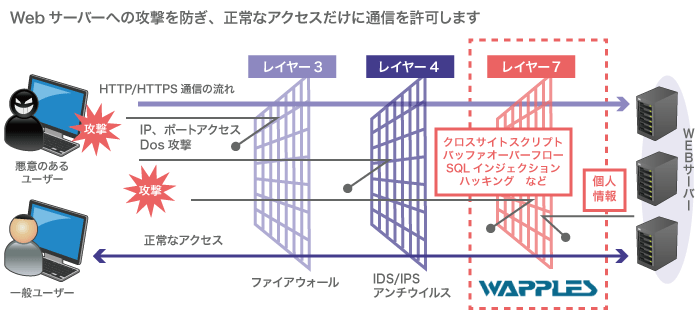 イーセクターは、情報漏えい対策サービス強化の一環として、クエストが販売するペンタセキュリティシステムズ株式会社開発のWAF※注1)アプライアンス「WAPPLES(ワップル)」を、セキュリティサービスメニューに追加いたします。本サービスの活用により、企業は外部からの不正なアクセスや不正侵入などの攻撃を迅速に検知し、ウェブアクセスによる脅威からサーバを保護することができます。「WAPPLES」は、日本国内で特許を取得した独自のロジック分析エンジンを採用し、高速かつ高精度に攻撃を検知し防御を行います。「WAPPLES」は、Webサーバへ送信されるHTTPトラフィックの分割されたパケットを再構成し、HTTPリクエストの内容を構文解析します。その上で、「WAPPLES」が定義するセキュリティルールに則り、攻撃に関連する内容を含んでいるかどうか的確に解析します。このため、管理者は攻撃の類型が変化する度に新たにパターン登録を行う必要はなく、最小限の運用負荷で高精度のセキュリティ管理を行うことが可能となります。