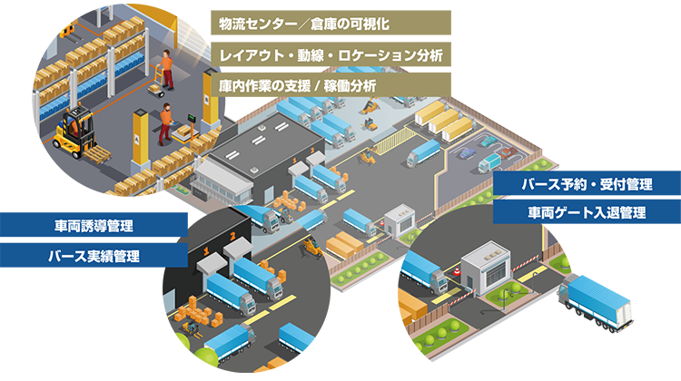 - バース予約機能と連携により、来場情報の事前共有、車両受入予定のバース計画作成、庫内の入出荷準備作業など後工程との同期を図り、待ち時間などムラ・ムダ解消につながります。