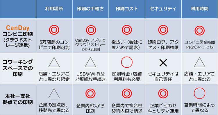 そこで、全国約5万店舗のコンビニエンスストアに設置されたマルチコピー機で印刷・スキャンができる「CanDay」と、クラウドストレージとの連携で、セキュアにいつでもどこでも印刷ができるようになります。