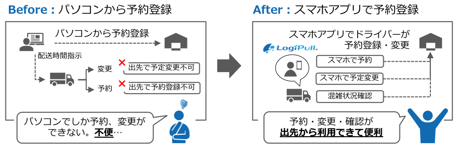 トラックドライバーが自身でバースを予約できる「LogiPull」専用スマートフォンアプリの提供を開始しました。バースの混雑状況を確認しつつ、道路混雑や車両運行にあわせて予約することができ、状況に則した予約枠の利用を促します。