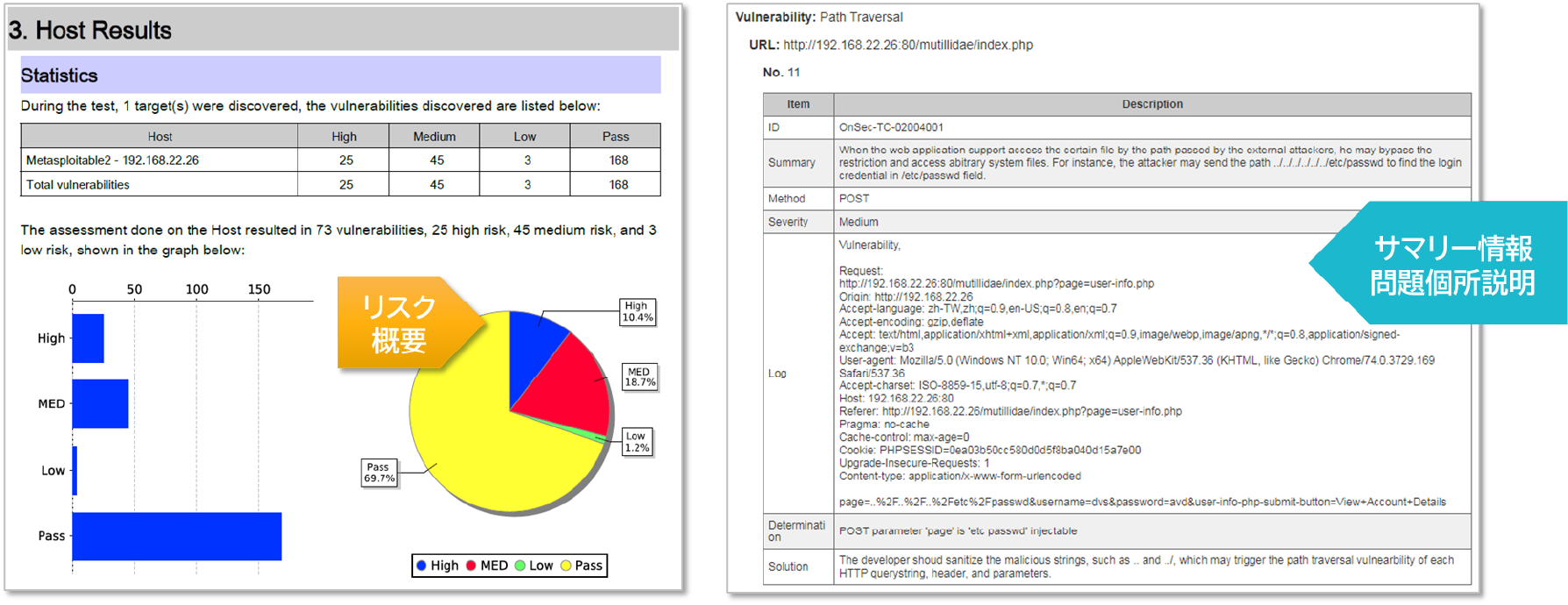 SecDeviceは管理者向け、開発者向け、2パターンのレポートを出力できます。管理者向けではどこにどのような問題が見つかったのか概要ベースで記載。