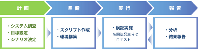 開発から運用まで豊富な経験を持つエンジニアが、現状調査、試験計画など計画・準備段階からしっかりとサポートいたします。キャンペーンを予定されているお客様の中には、どのくらいの負荷になるのか分からないという方や、システムのリニューアルをされる方の中には、どのような使われ方をしているのかを知らない、というお客様も多くいらっしゃいます。そのようなお客様に対しても、Webシステムの場合は想定されるアクセスの調査や分析、業務システムの場合は従業員の方への現状のヒアリングなどを行った上で、必要なテストを設計しご提案いたします。