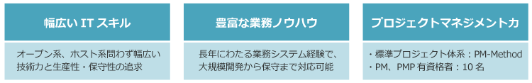 - Java、.NETだけでなくホスト系(COBOL)技術経験も豊富で、ホストーOpen連携システムを一括でご提供することが可能です。